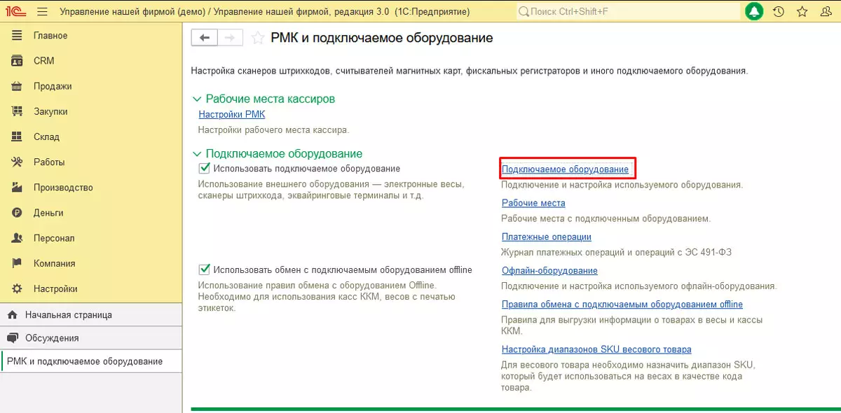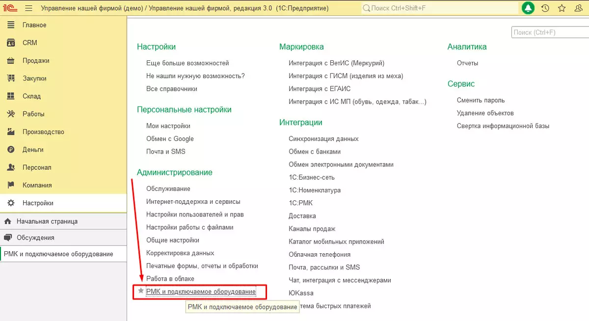 Если в компании есть дополнительное оборудование, которое необходимо подключить к 1С:УНФ, нужно выполнить несложные настройки. Находим раздел Настройки – Администрирование – РМК и подключаемое оборудование.