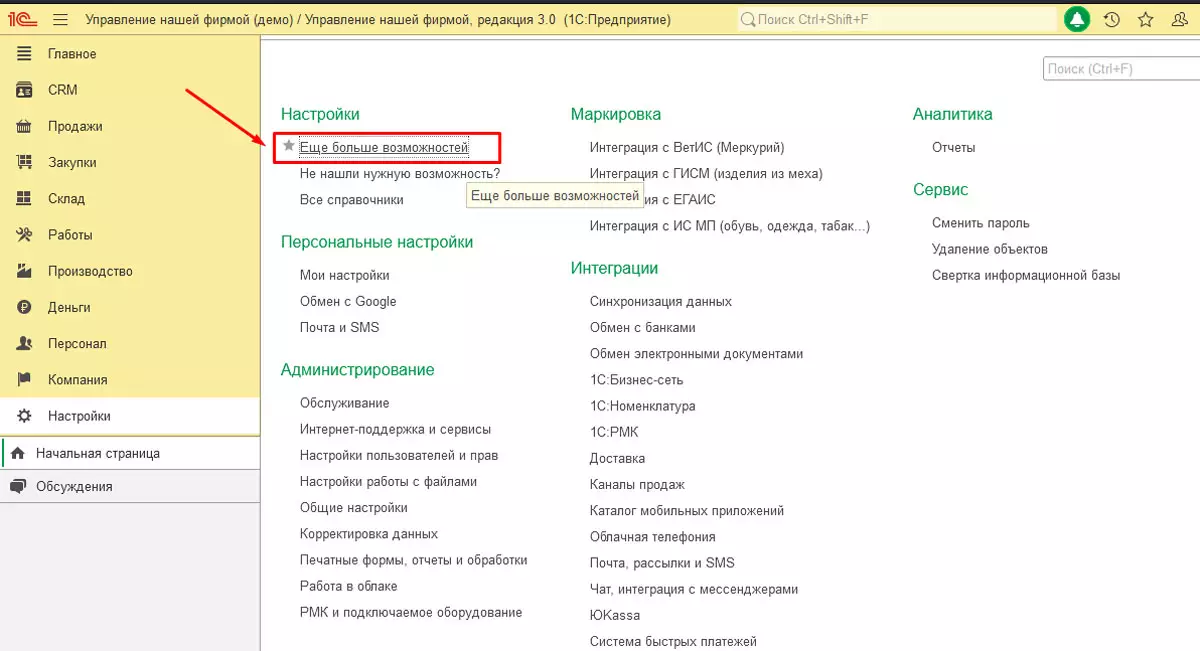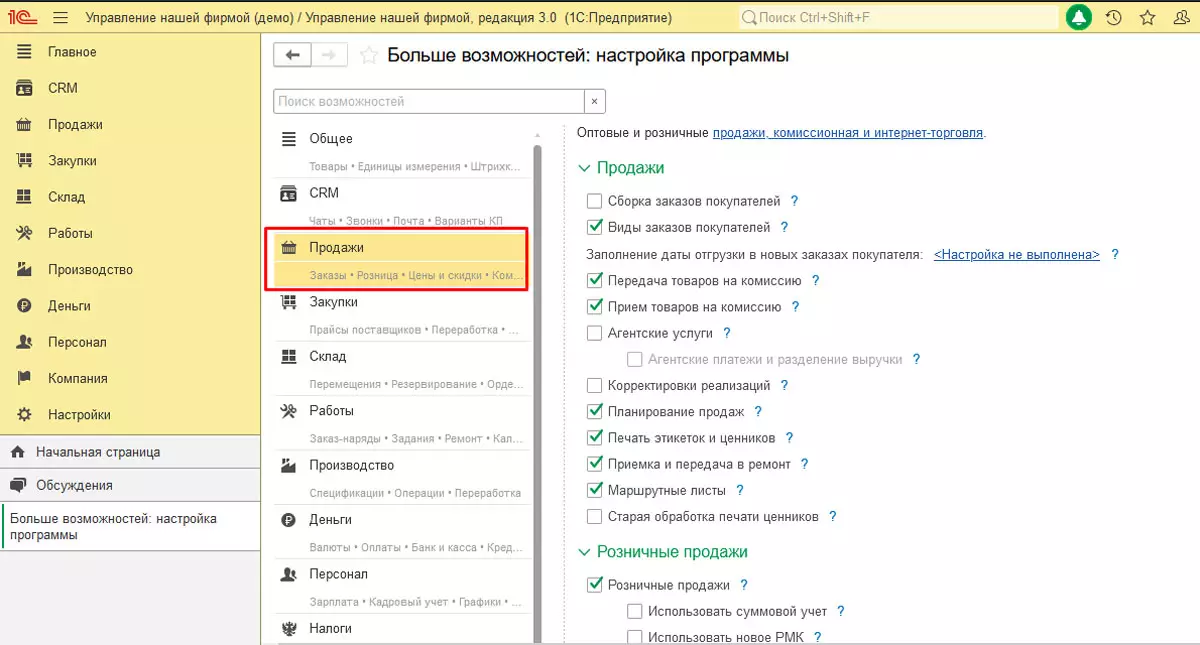 В блоке Продажа открыта возможность настройки дисконтных карт для покупателей, введения скидок и акций в документах продаж, создания бонусных программ. Также есть возможность включения «Агентских услуг», если требуется перепродажа услуг партнеров, настройка и управление маршрутными листами и многие другие полезные и необходимые функции.