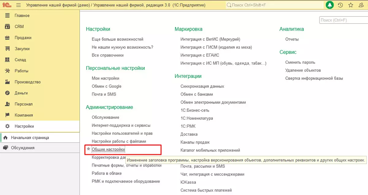 Чтобы настроить классификацию адресов, телефонов и другой контактной информации у партнеров, контрагентов или сотрудников, заходим в раздел Настройки на основной панели управления – Администрирование – Общие настройки.