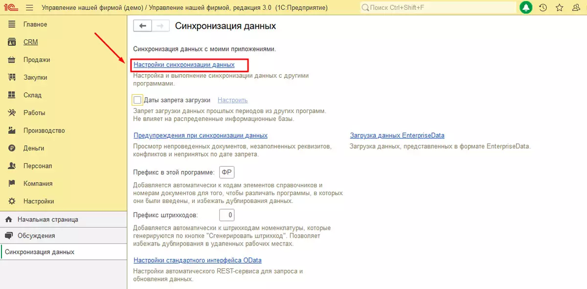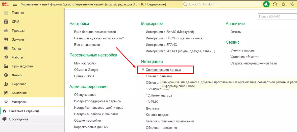 Для этого находим раздел Настройки – Интеграции – Синхронизация данных.