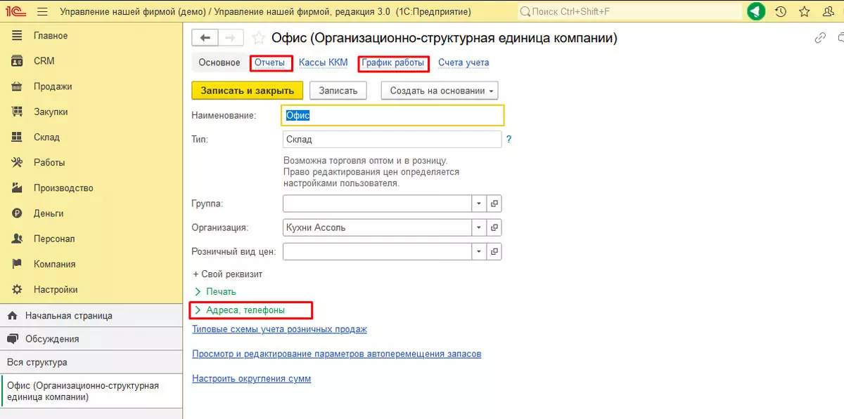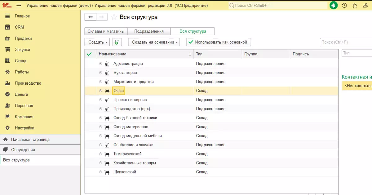 В случае, когда у организации имеются подразделения, склады или филиалы, нужно выполнить настройку Подразделения в том же блоке Компания. Здесь будет храниться информация о функциональных отделах и складах, график их работы, адреса и телефоны, а также отчеты по текущей деятельности.