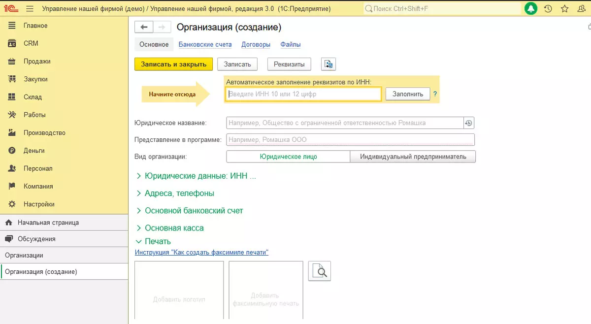 Для автоматического заполнения реквизитов по ИНН воспользуйтесь сервисом 1С:Контрагент. Первый месяц бесплатно!
