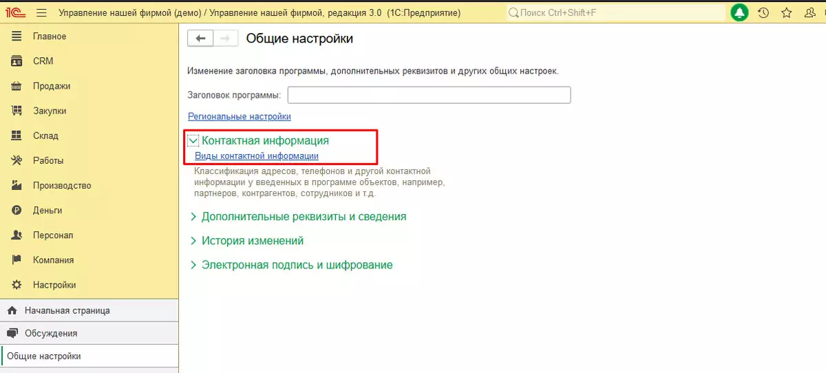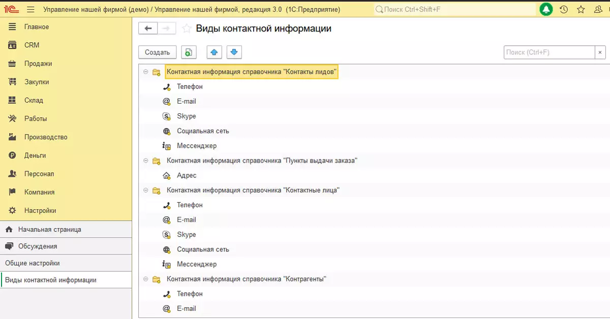 Выбираем в разделе Контактная информация – Виды контактной информации. Здесь пользователю открывается возможность настроить макет данных под свои потребности, которые будут отображаться у того или иного справочника.