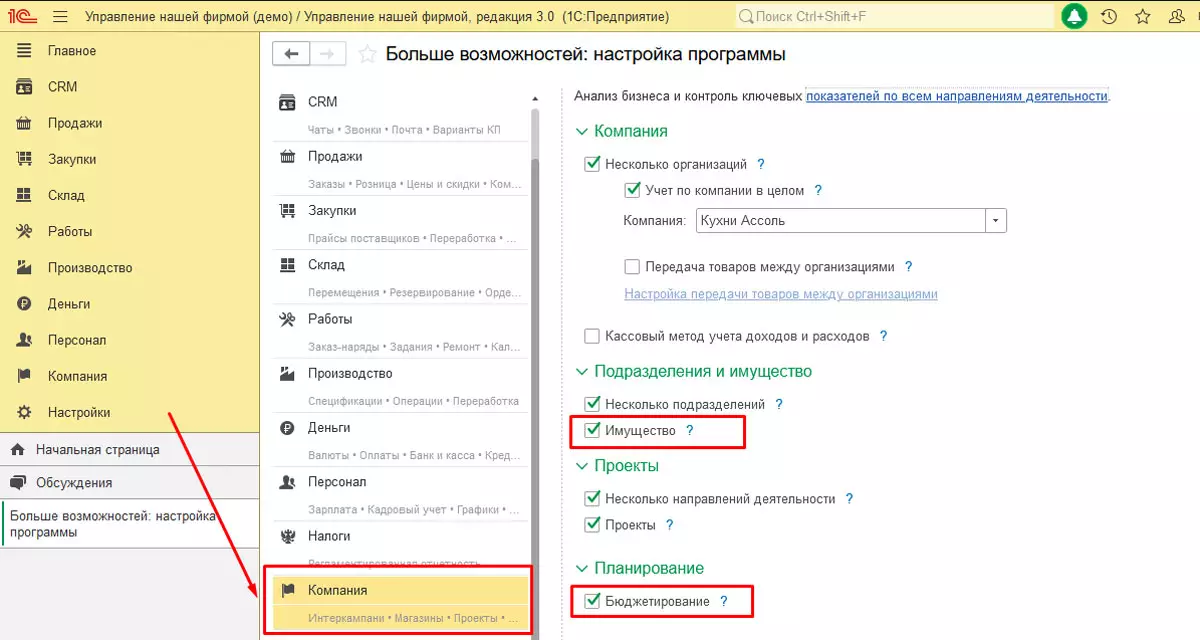 Если в компании принято составлять финансовый план и тщательно следить за его выполнением, нужно отметить Бюджетирование для открытия тематических документов в разделе Компания – Развитие бизнеса.