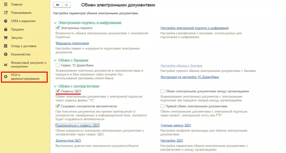 Чтобы подключиться к сервису 1С-ЭДО, в типовом решении 1С:Управление торговлей нужно в разделе НСИ и администрирование включить возможность обмена электронными документами через сервисы фирмы «1С» – галочка Сервисы ЭДО.