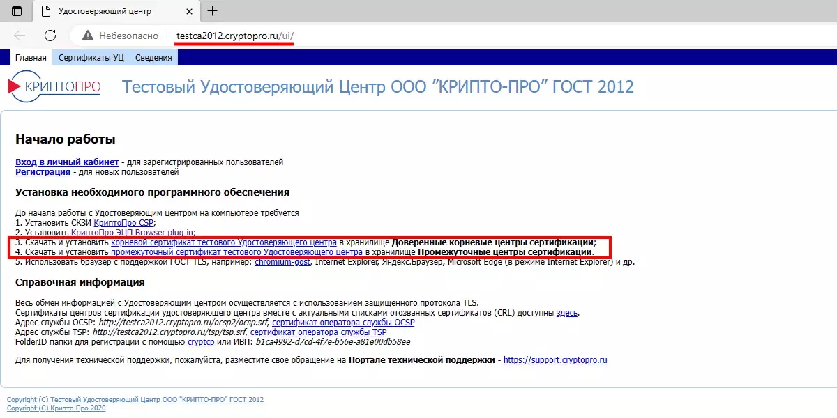 В качестве примера мы скачаем тестовый корневой сертификат тестового удостоверяющего центра, который нам позволит использовать в режиме тестирования функционал программы 1С:УТ по обмену электронными документами.