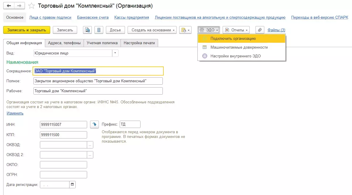 Для успешного подключения необходимо заполнить все реквизиты организации. Здесь же можно сформировать машиночитаемые доверенности и настроить сервисы 1С-ЭДО для работы внутри организации.
