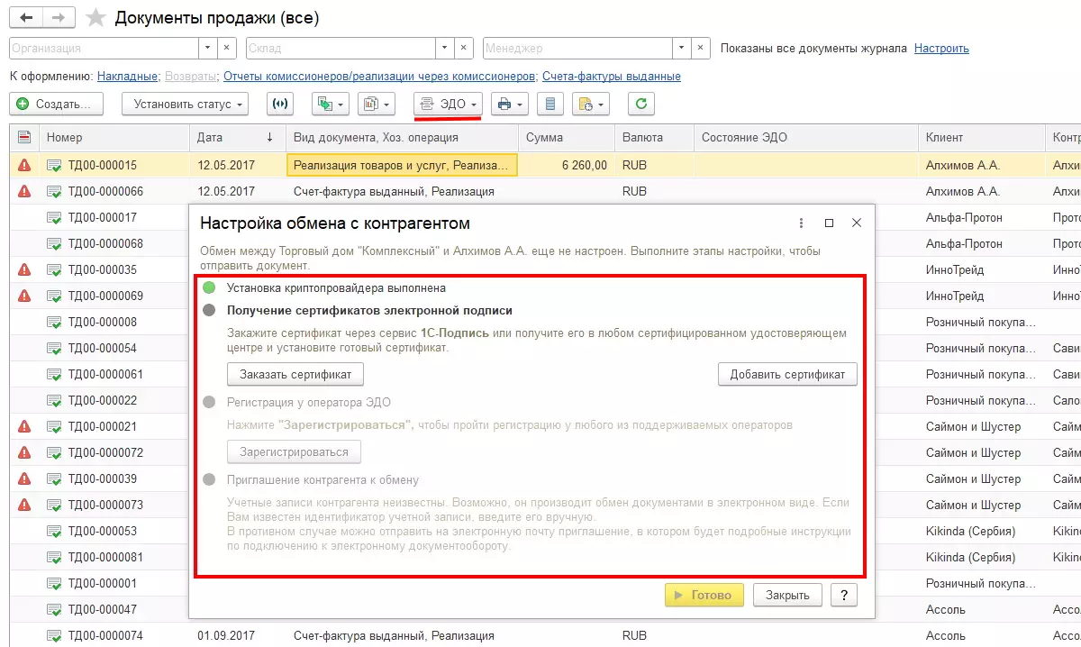 При отправке документа через сервис 1С-ЭДО, если нет электронной подписи, то программа запросит получение сертификата на ЭП. Если же электронная подпись есть, то программа 1С:УТ запросит настройку обмена электронного документооборота с конкретным контрагентом.