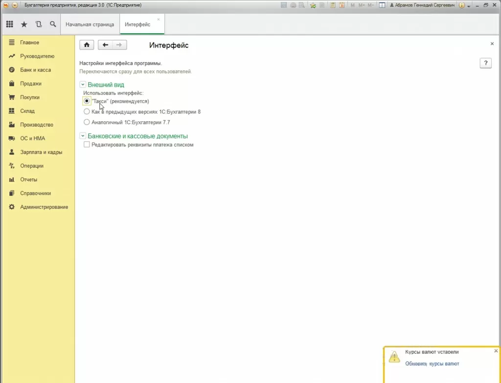 Стоит отметить, что за время существования 1С:Бухгалтерия предприятия, редакции 3.0, работающей соответственно на платформе «1С:Предприятие 8.3», интерфейс успел претерпеть несколько изменений. В частности, было увеличено количество доступных вариантов интерфейса, среди которых: