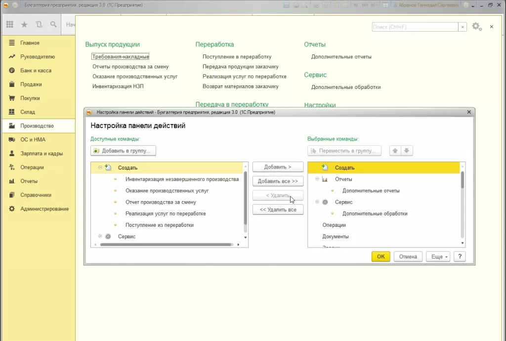 Окно настройки панели действий позволяет добавлять и удалять разделы, вплоть до полного удаления.