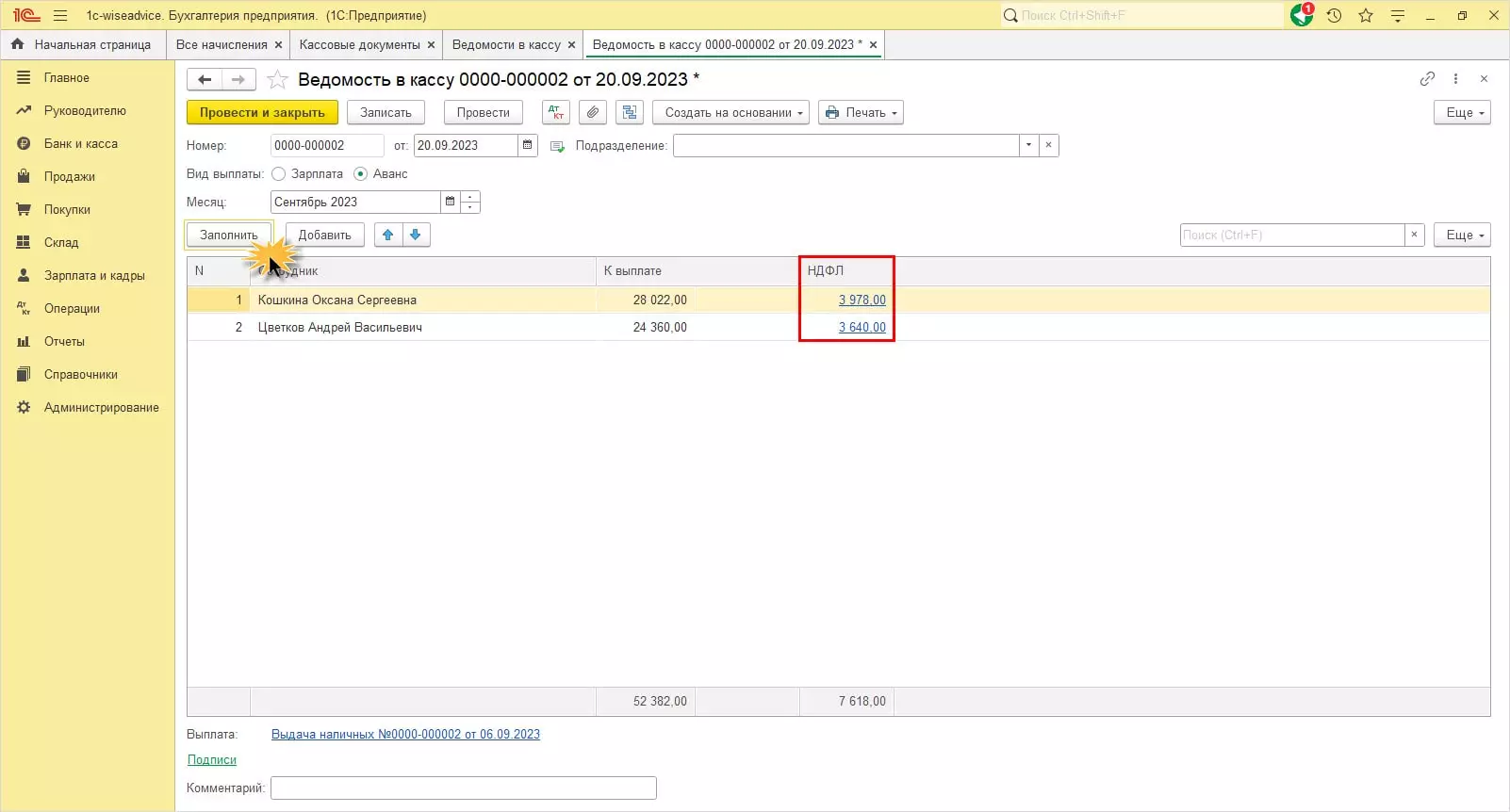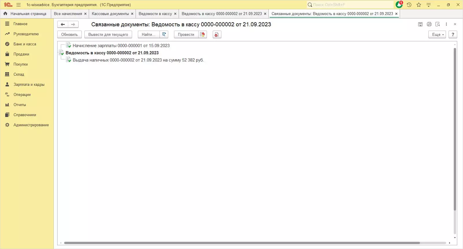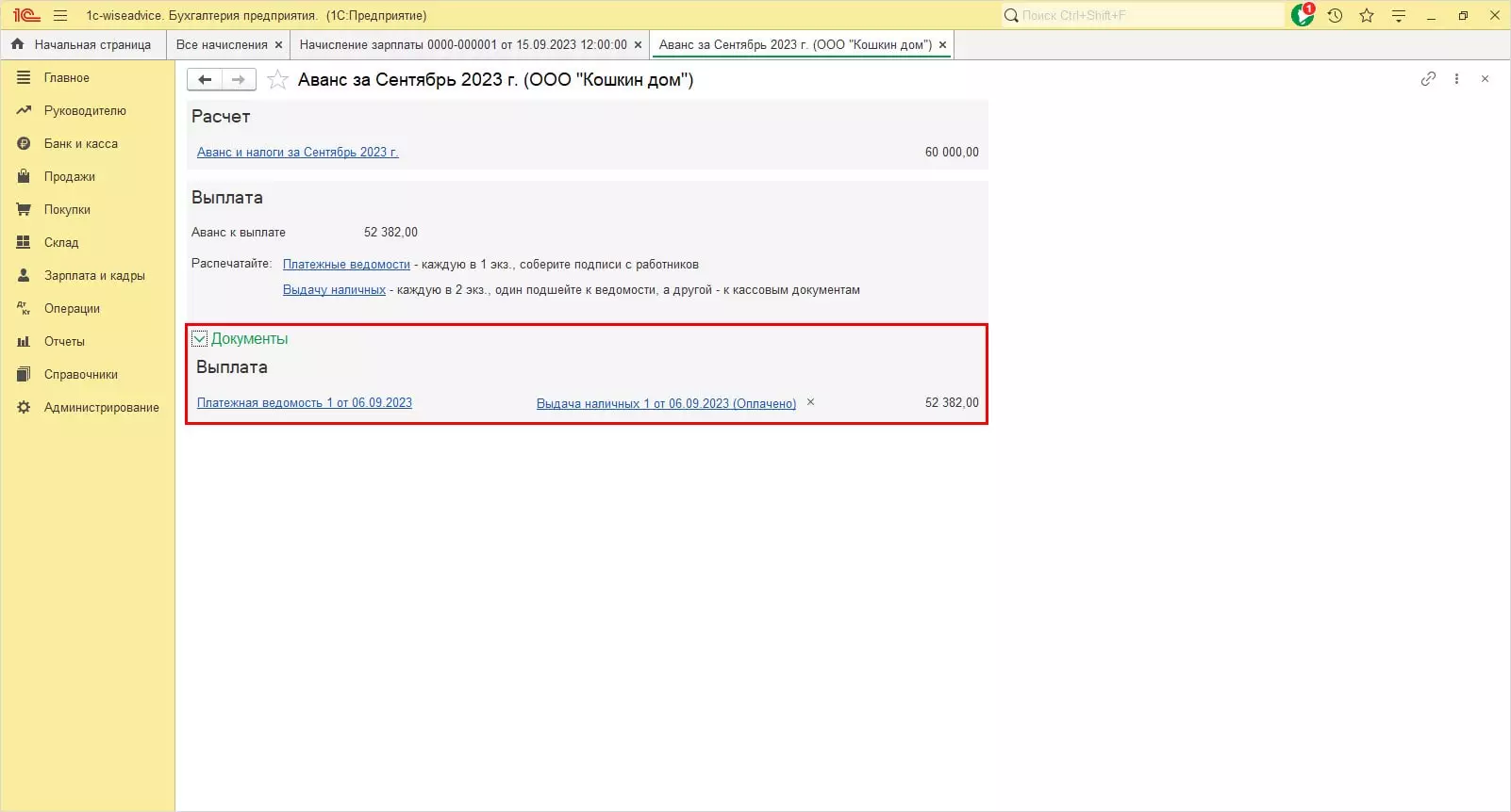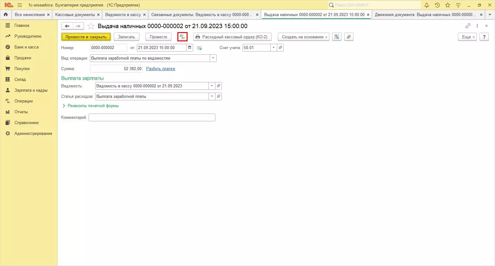 Программа автоматически сформировала документы «Ведомость на выплату» и «Выдача наличных».