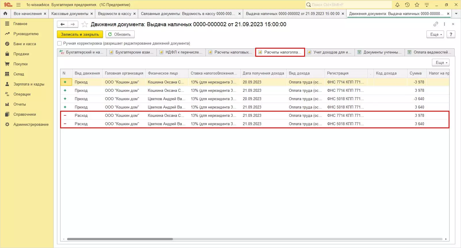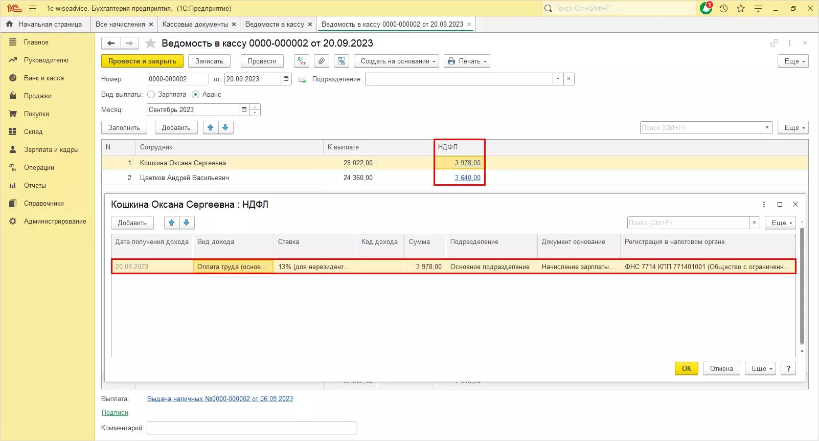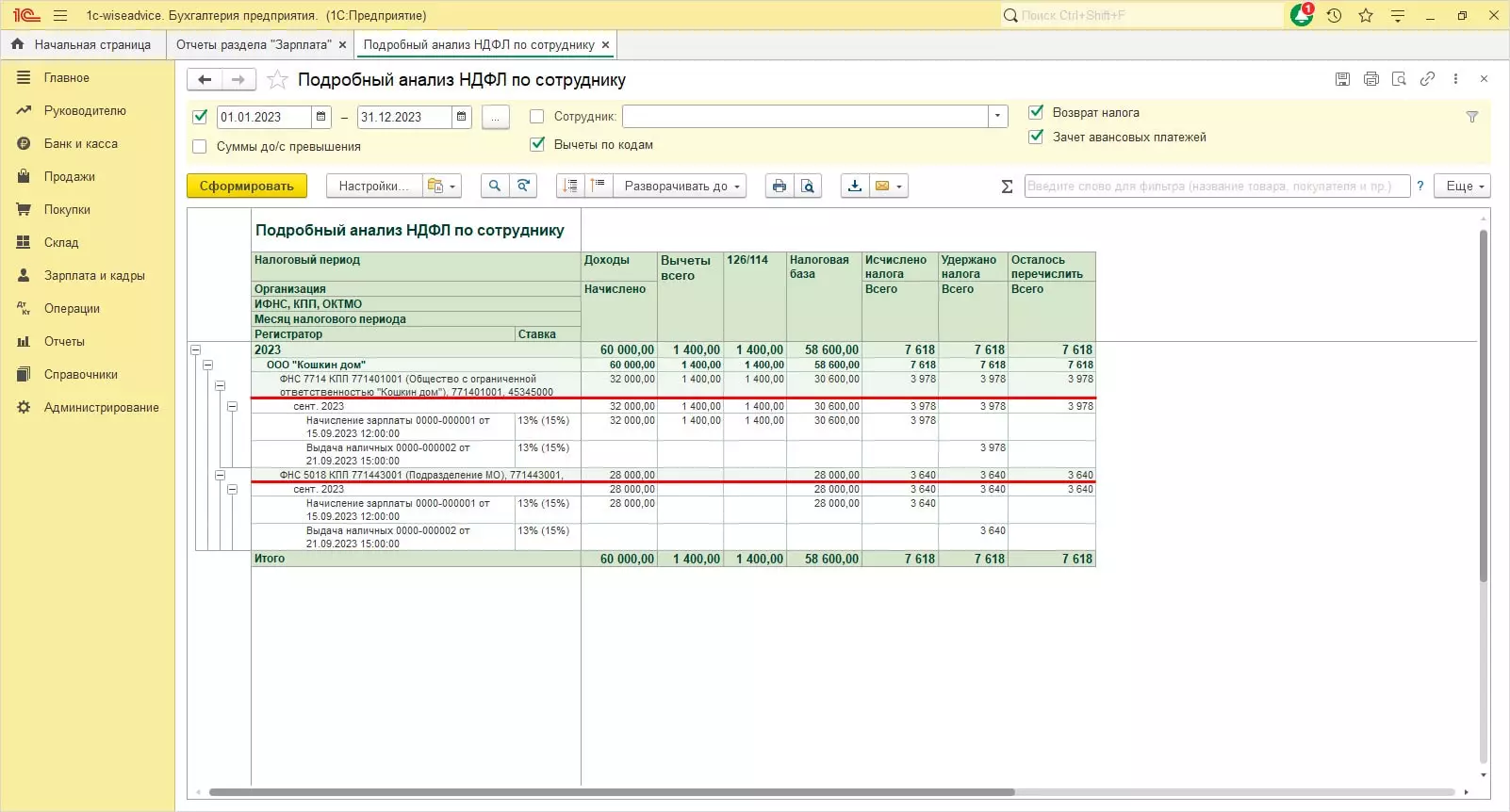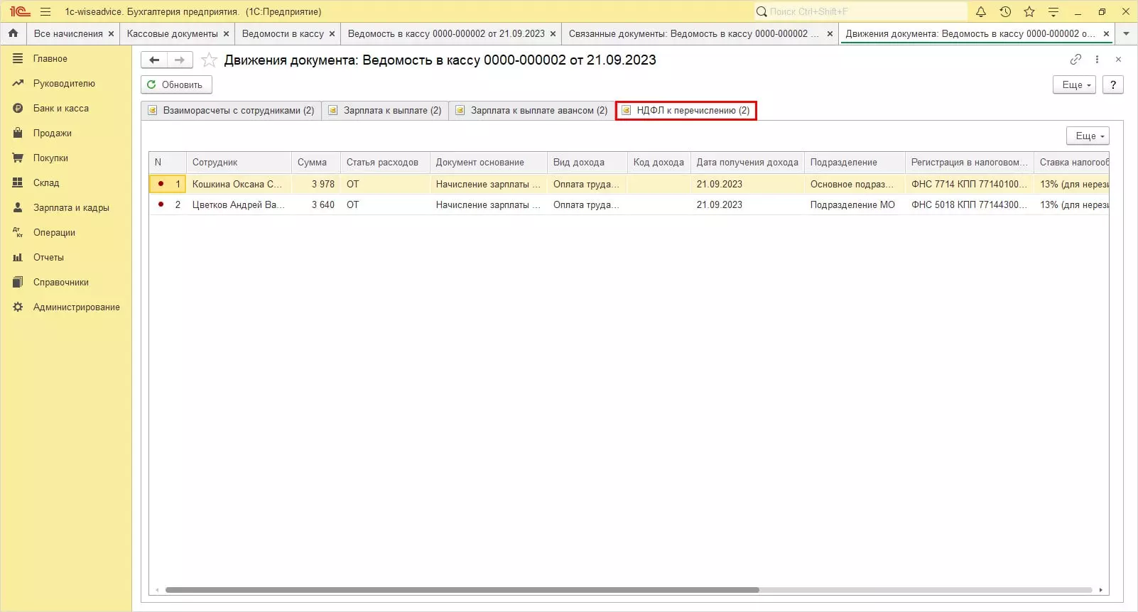И обратите внимание, что суммы НДФЛ прошли по регистрам в разрезе двух ИФНС – по основному подразделению, где числится сотрудник Кошкина О.С., и обособленному подразделению с сотрудником Цветковым А.В.