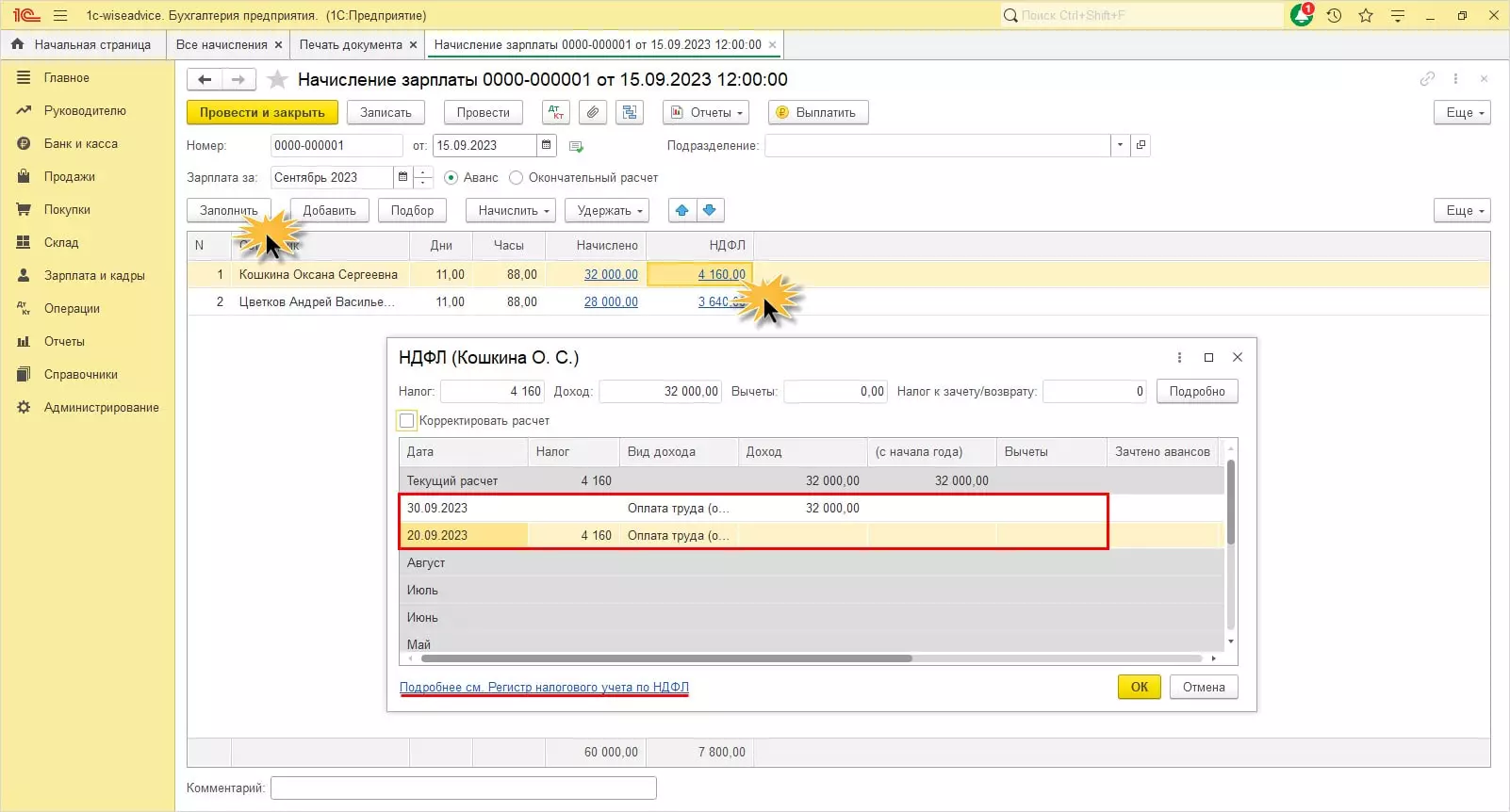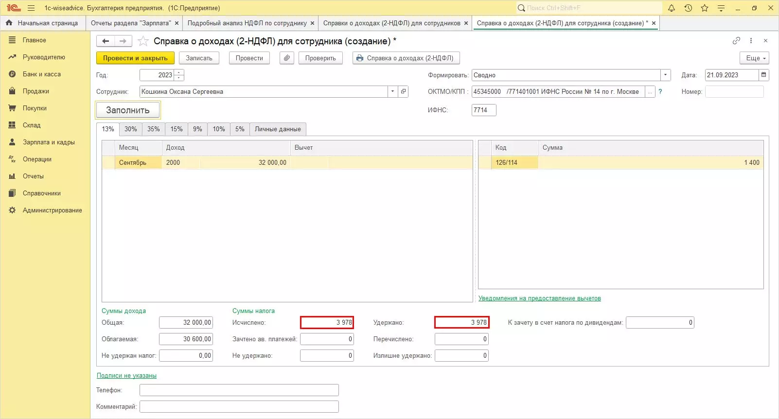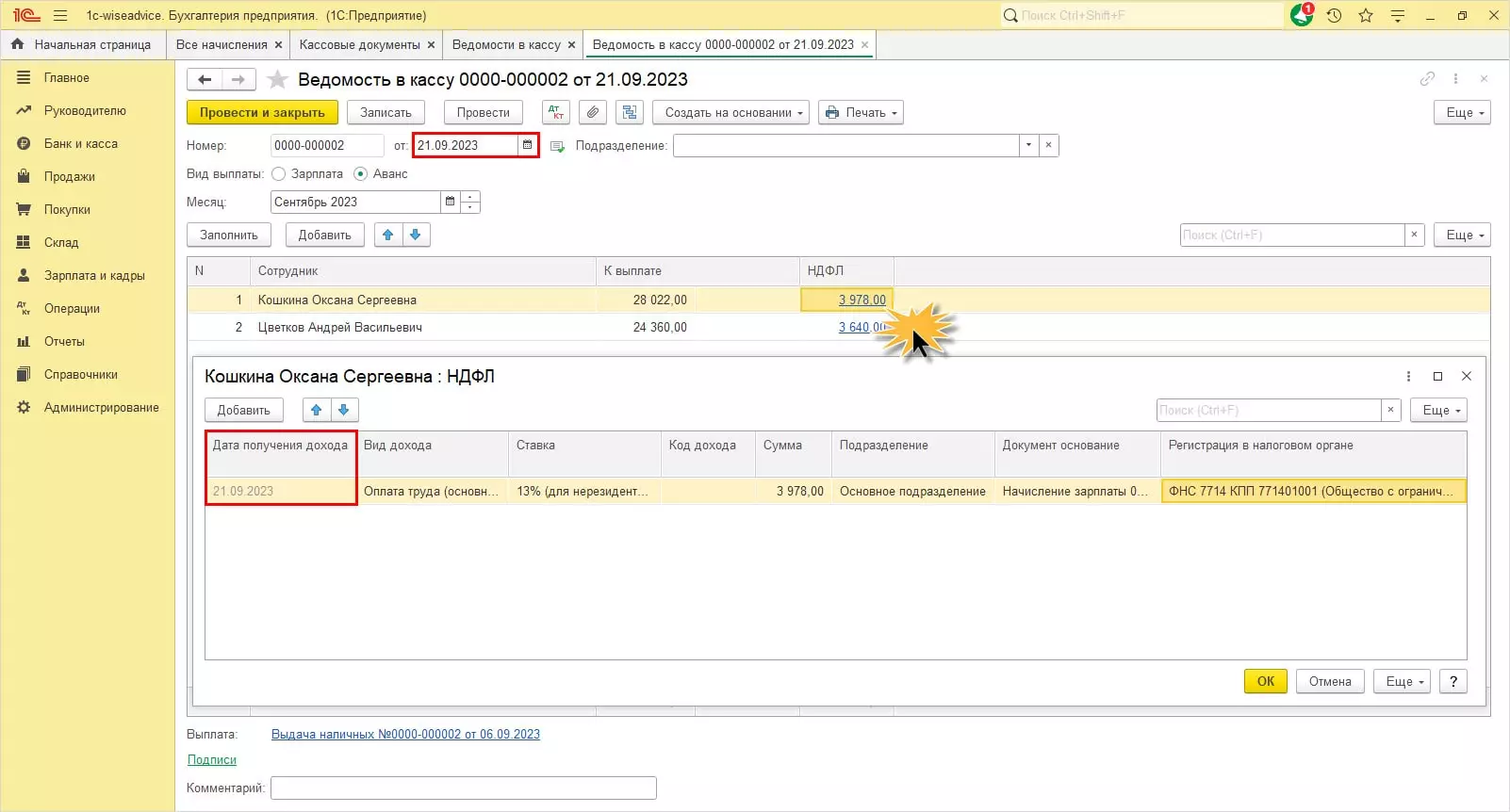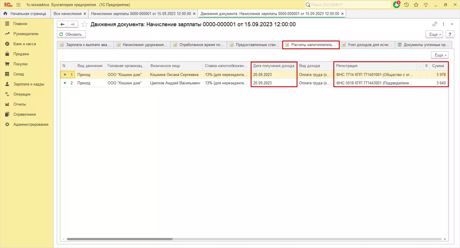 И обратите внимание, что суммы НДФЛ прошли по регистрам в разрезе двух ИФНС – по основному подразделению, где числится сотрудник Кошкина О.С., и обособленному подразделению с сотрудником Цветковым А.В.