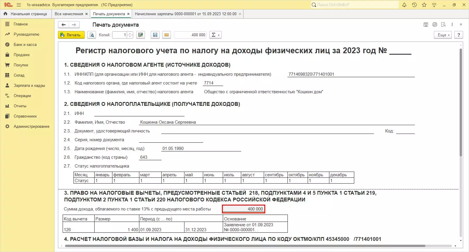 Из регистра видно, что сумма дохода с начала года, согласно введенной нами справки с предыдущего места работы, составила 400 000 руб.