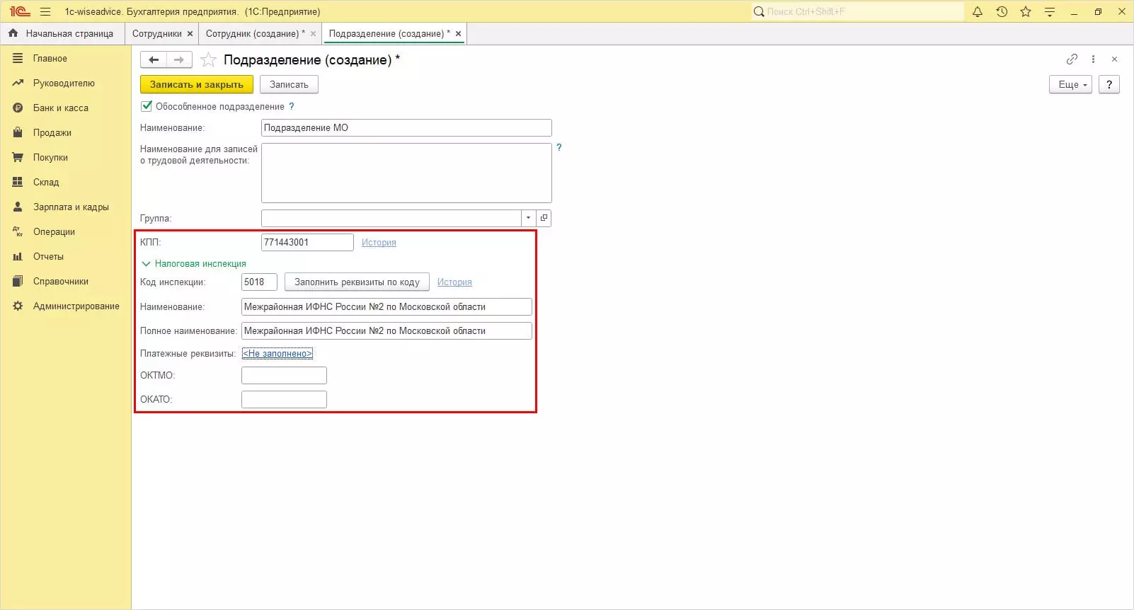 Для обособленных подразделений также заполните данные ИФНС и внесите платежные реквизиты.