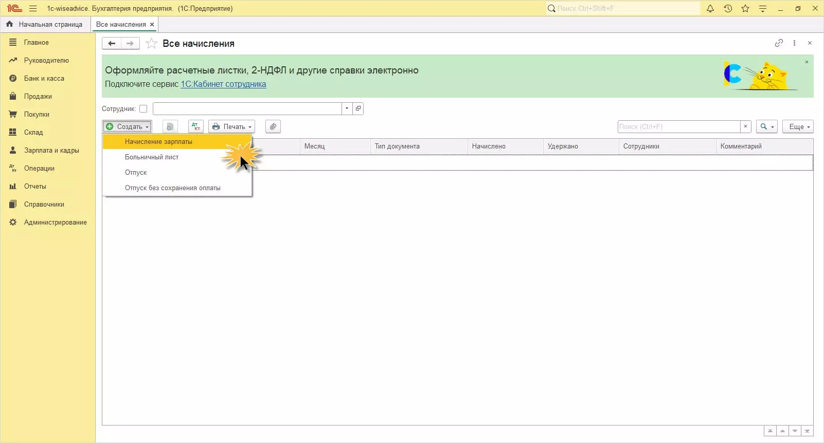 Шаг 2. Нажмите «Создать» – и далее строка «Начисление зарплаты».