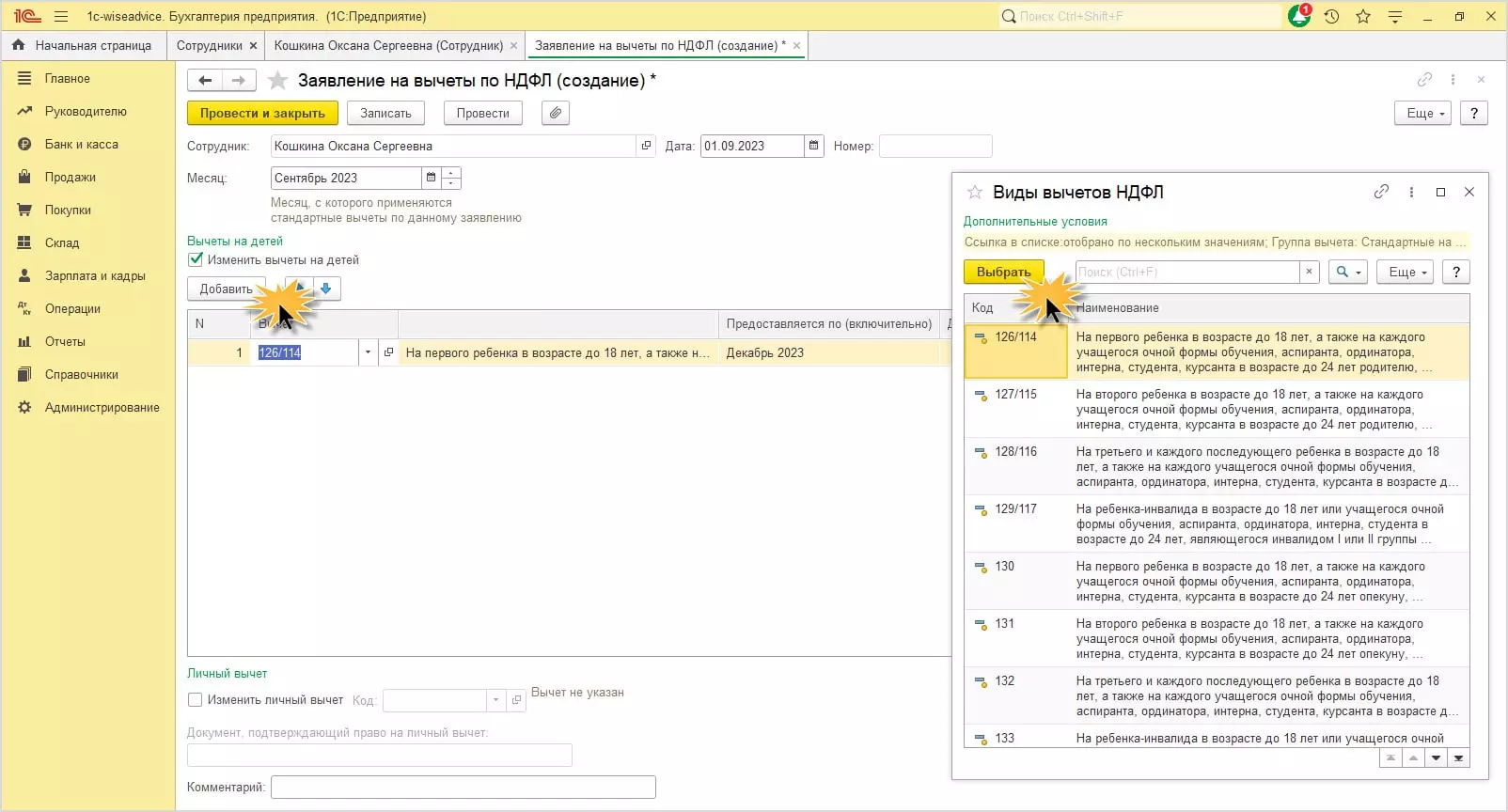 Добавьте строку с кодом вычета из предлагаемого перечня, укажите месяц, по который данный вычет предоставляется и проведите документ.