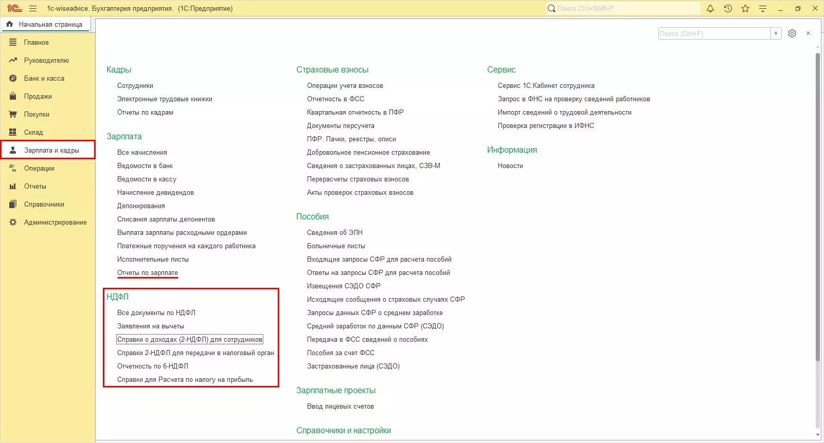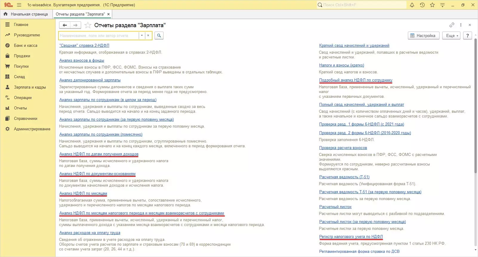 Кроме блока отчетов НДФЛ, в разделе Зарплата и кадры, где формируется Справка о доходах (2-НДФЛ) и отчетность 6-НДФЛ, есть и много полезных отчетов в разделе Отчеты по зарплате.