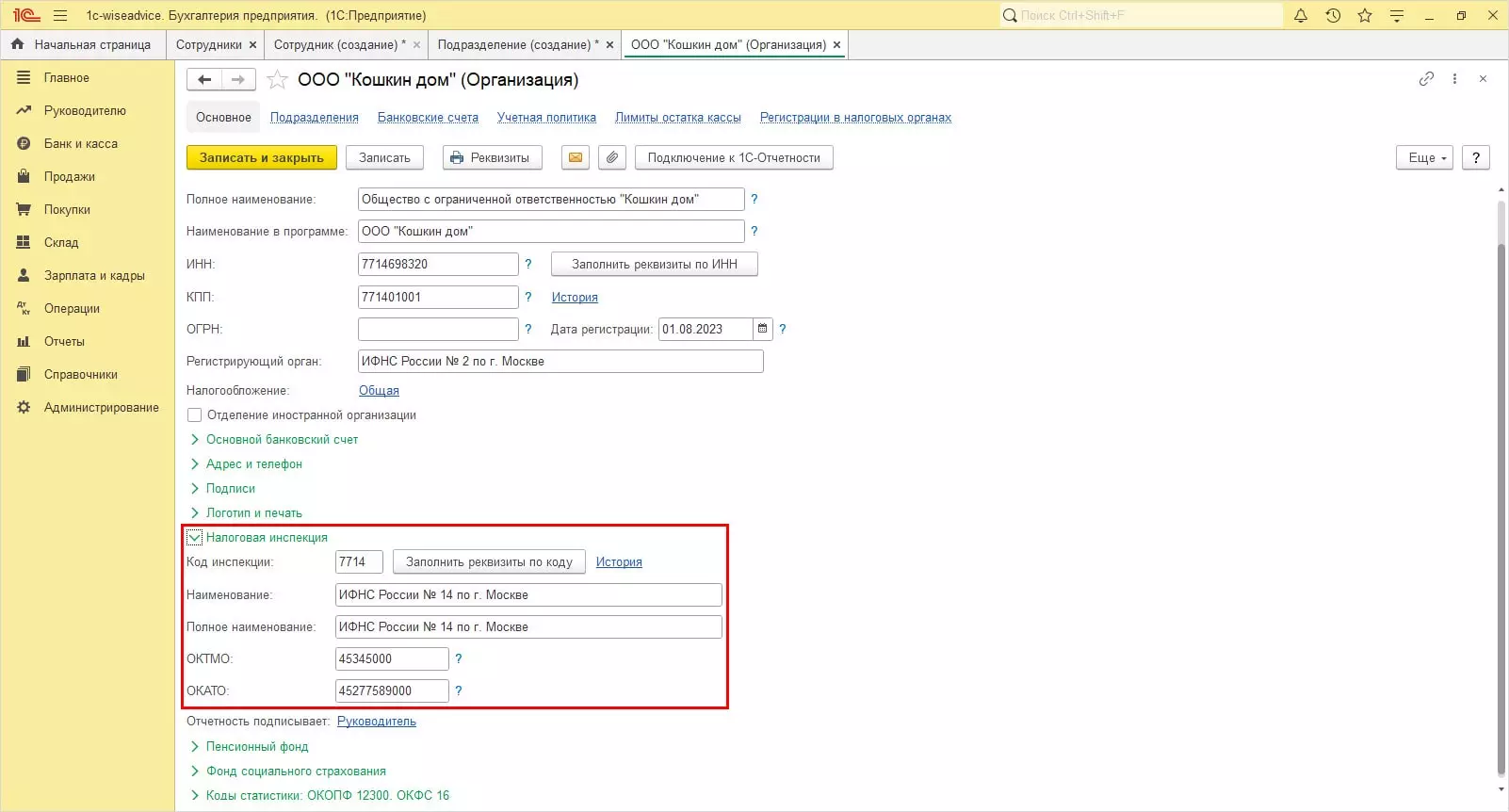 Перейдем к заполнению данных об ИФНС. В карточке организации, раздел Главное – Реквизиты организации, заполните сведения о налоговой инспекции. Эта информация используется при формировании отчетности.