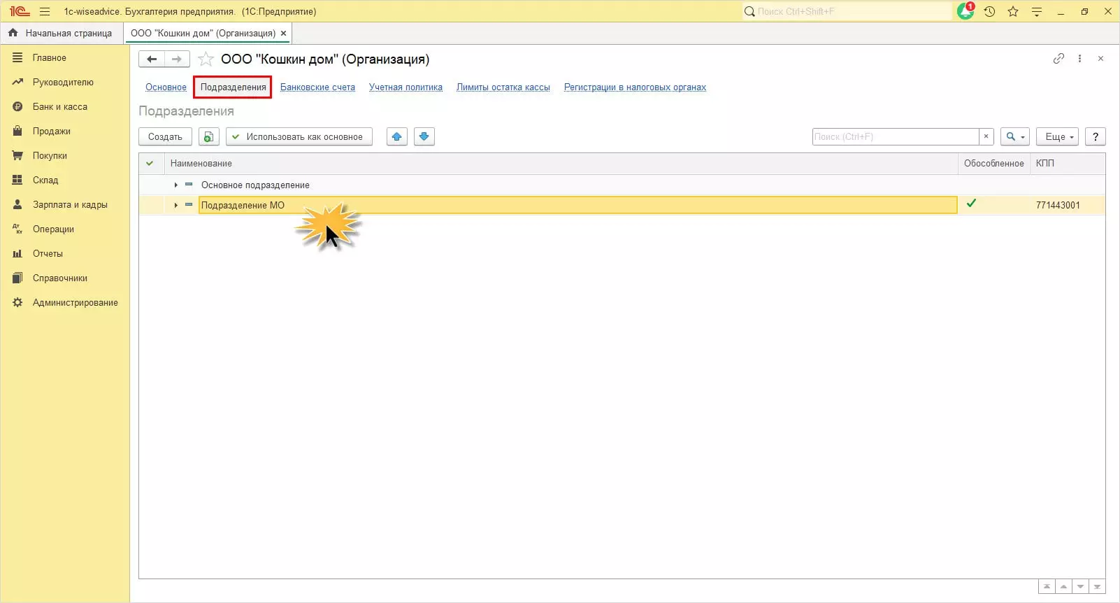 Перейти к подразделениям можно через карточку реквизитов организации – вкладка «Подразделения».