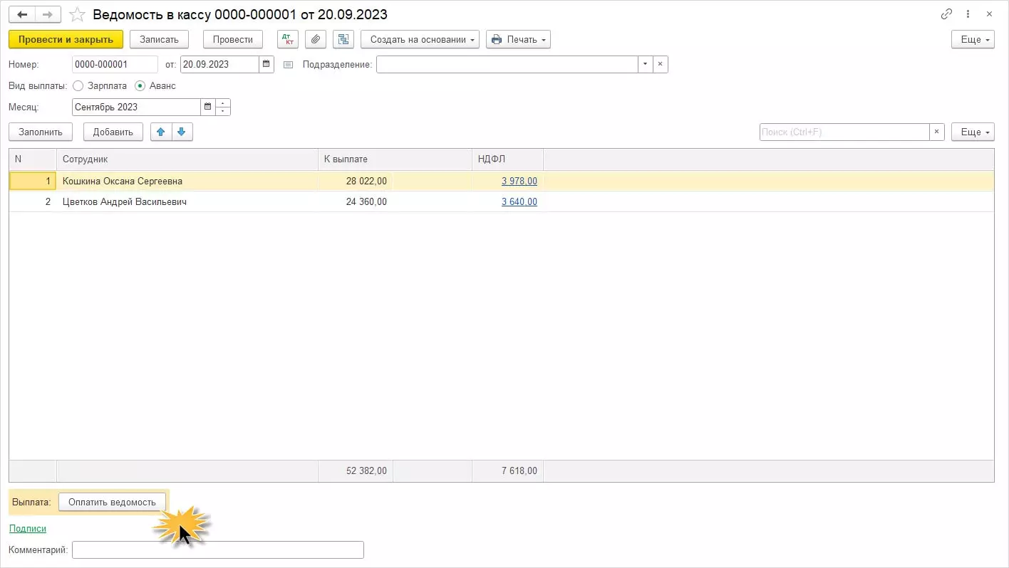 Для удобства рассмотрения в примере мы сформировали общую ведомость на выплату и выдачу наличных по сотрудникам двух подразделений.