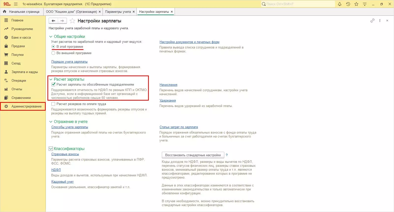 Перейдите в раздел Параметры учета – Настройки зарплаты в меню Администрирование. Данный раздел доступен также в меню «Зарплата и кадры».