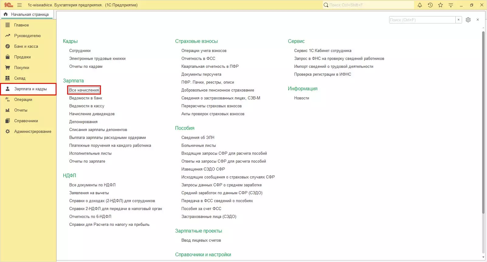 Шаг 1. Перейдите в раздел меню Зарплата и кадры – Начисления.