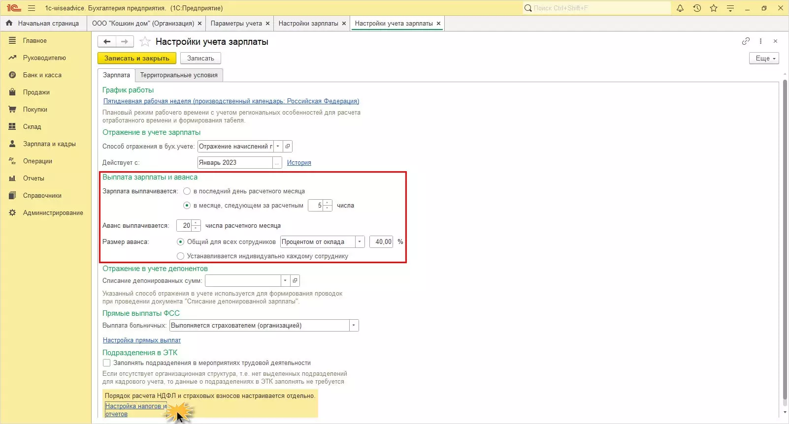 Из настроек зарплаты перейдите по гиперссылке «Порядок учета зарплаты». Здесь устанавливаются настройки выплаты зарплаты и аванса. Из данной настройки дата автоматически проставляется в документы выплаты зарплаты и фиксирует дату получения дохода, а этот факт важен для учета НДФЛ.