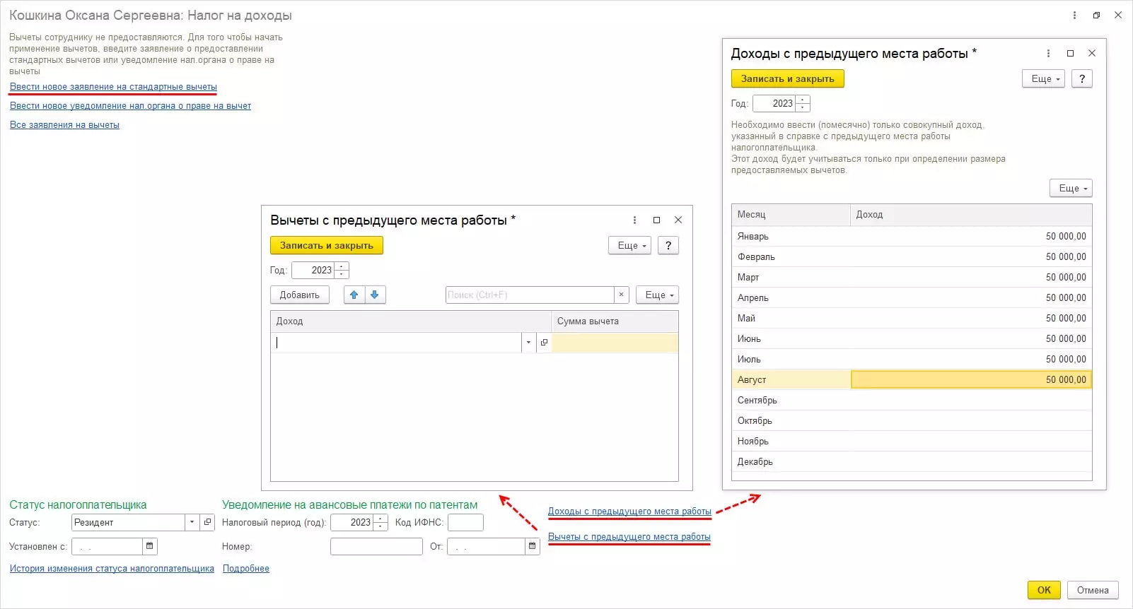 В этом же разделе вносятся сведения о доходах с предыдущего места работы и ранее предоставленных вычетах, нажатием на одноименные гиперссылки.