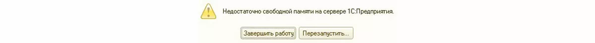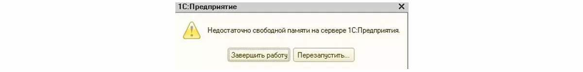 Намного серьезнее стоит относиться к сообщению о том, что недостаточно памяти на сервере при обновлении или масштабной работе. Проблема может быть в несвоевременном завершении процессов, запускаемых различным ПО, вследствие чего происходит «наслоение» и накопление их в виртуальной памяти. Второй источник подобной ошибки – интенсивная работа различных программ с резервированием и освобождением памяти. Существует различное ПО для решения этих проблем, но практика показывает, что оно вызывает разрывы соединений и падения 1С.