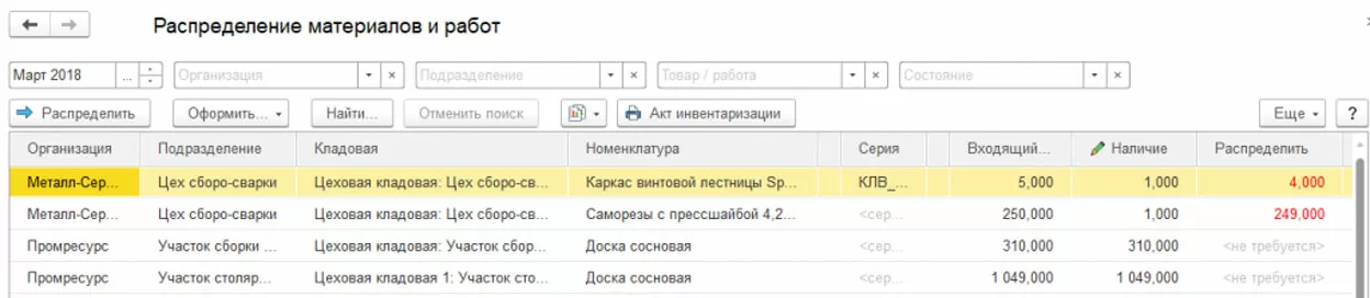 Инвентаризация НП в части номенклатурных затрат реализуется посредством «Распределение материалов и работ» (монитор или рабочее место/РМ).