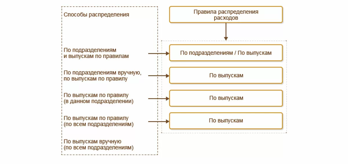 - «По этапам/по правилу (в этом подразделении)». Затраты распределяются по указанному правилу внутри подразделения, где они были зарегистрированы.