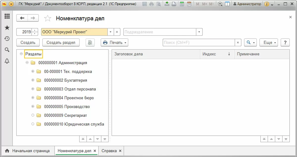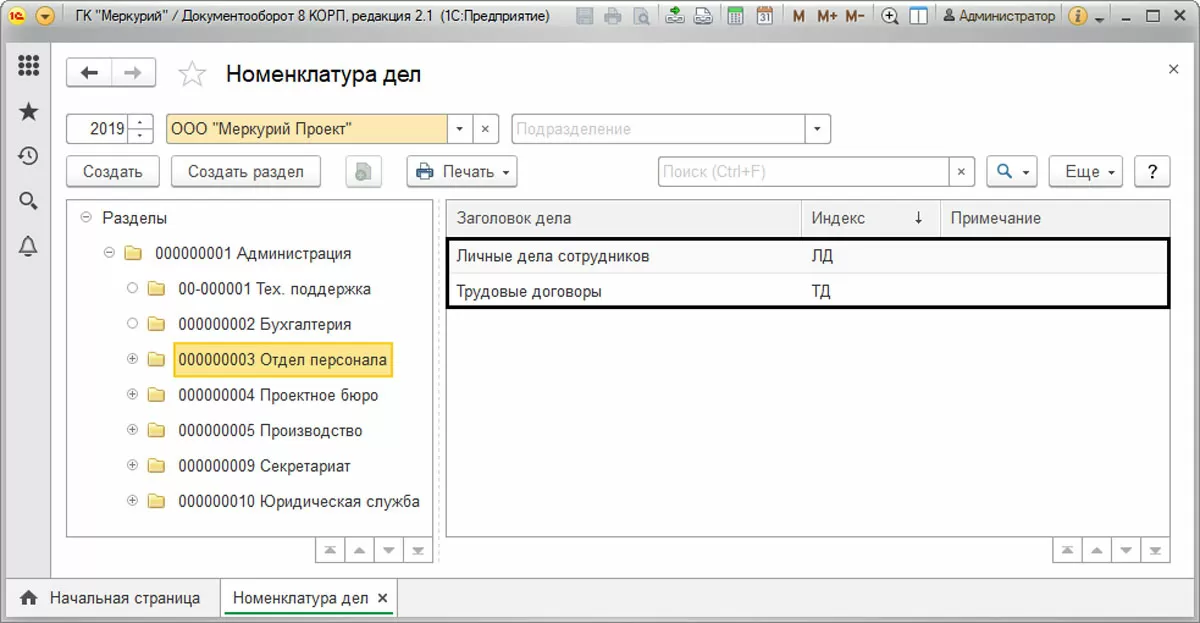 Номенклатура дел формируется на год и может быть автоматически перенесена на следующий год.