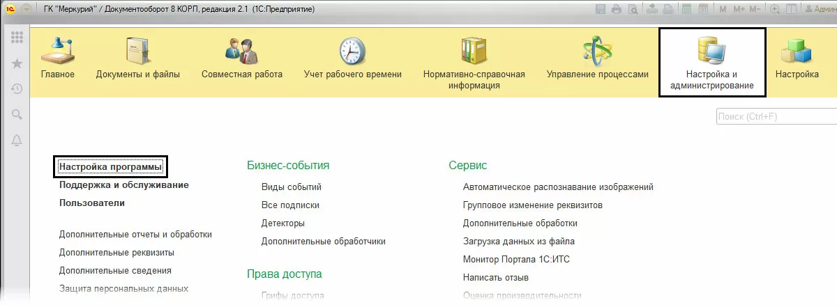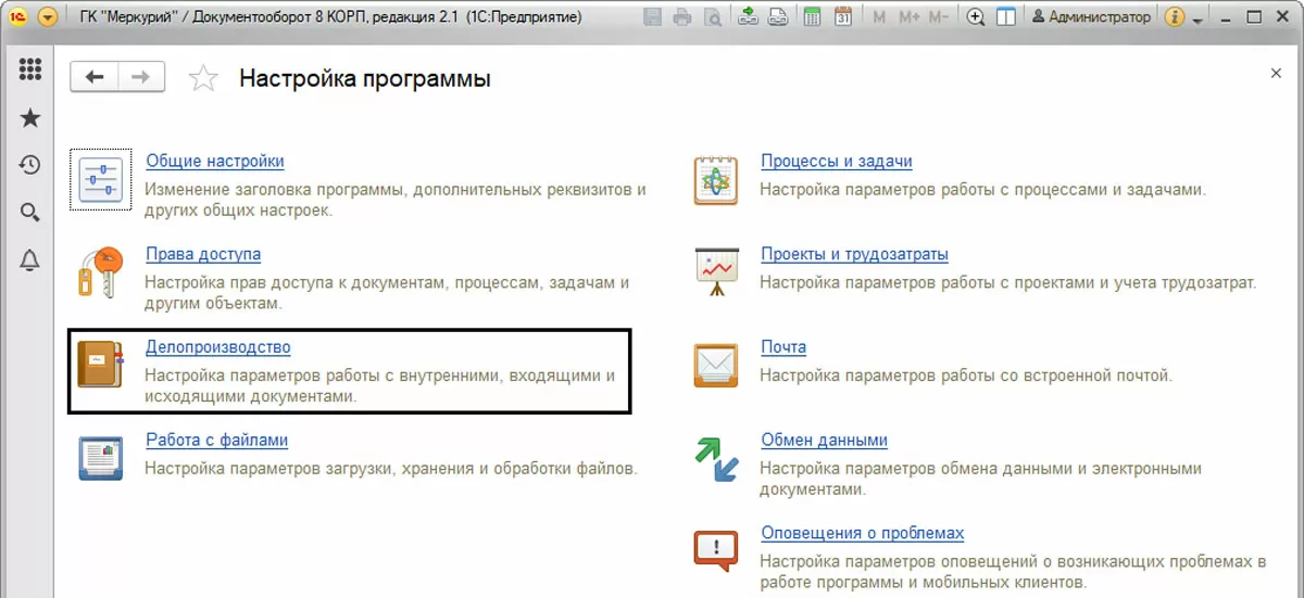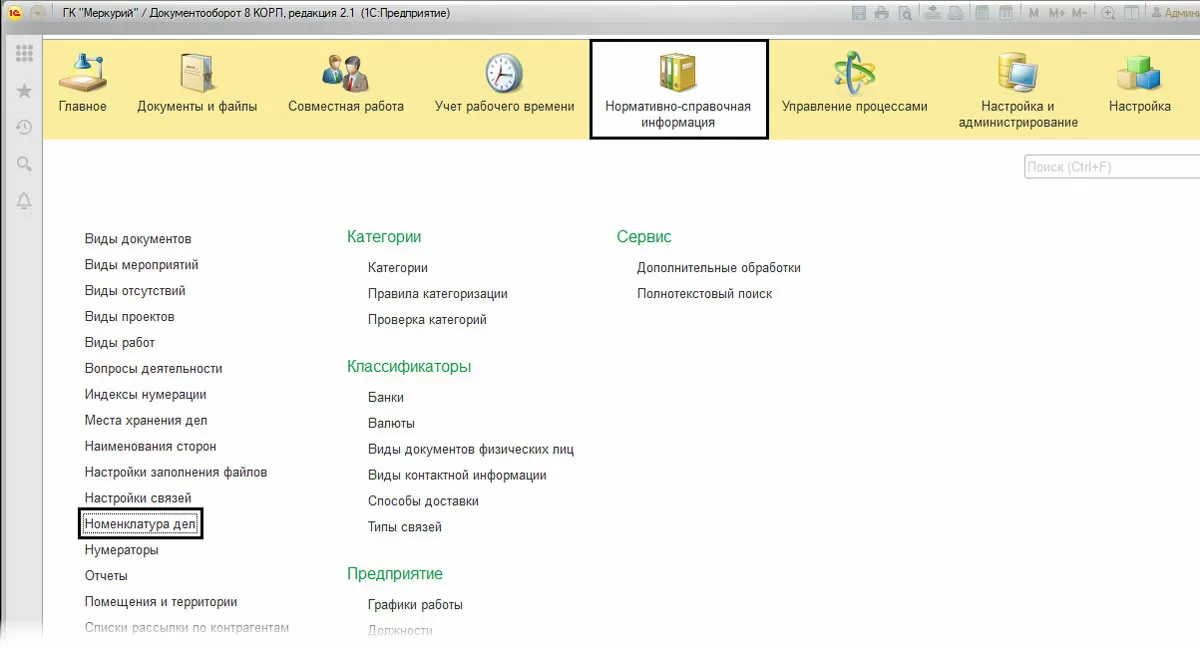 Для того чтобы данный справочник был доступен, в разделе «Настройка и администрирование-Настройка программы» по гиперссылке «Делопроизводство» должна быть установлена галочка «Использовать номенклатуру дел».