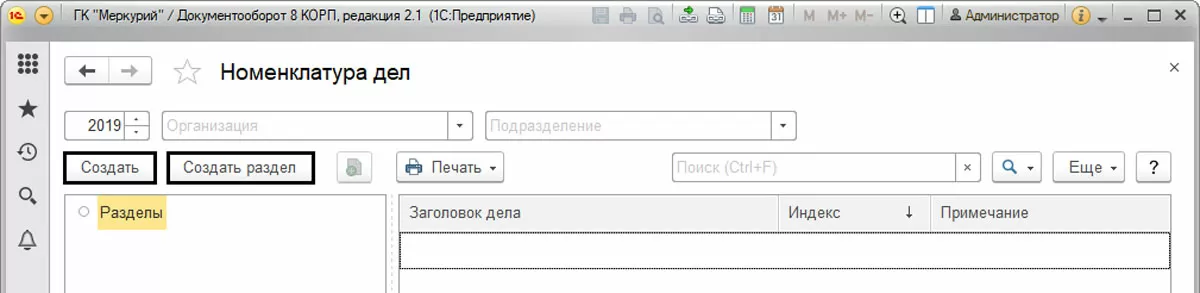 В справочнике, помимо создания томов (по нажатию на «Создать»), можно создавать и разделы. Чаще используют деление по структуре предприятия – кнопка «Создать раздел».