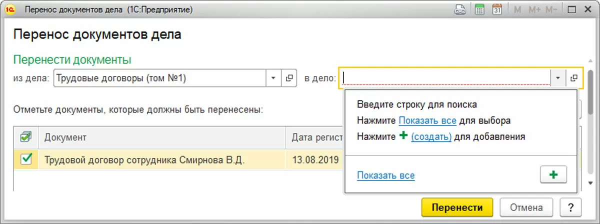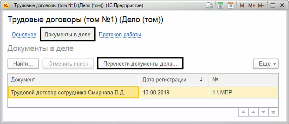 На закладке «Документы в деле» можно увидеть список документов, включенных в данный том, и при необходимости перенести документ из данного тома в другой по кнопке «Перенести документы дела...».