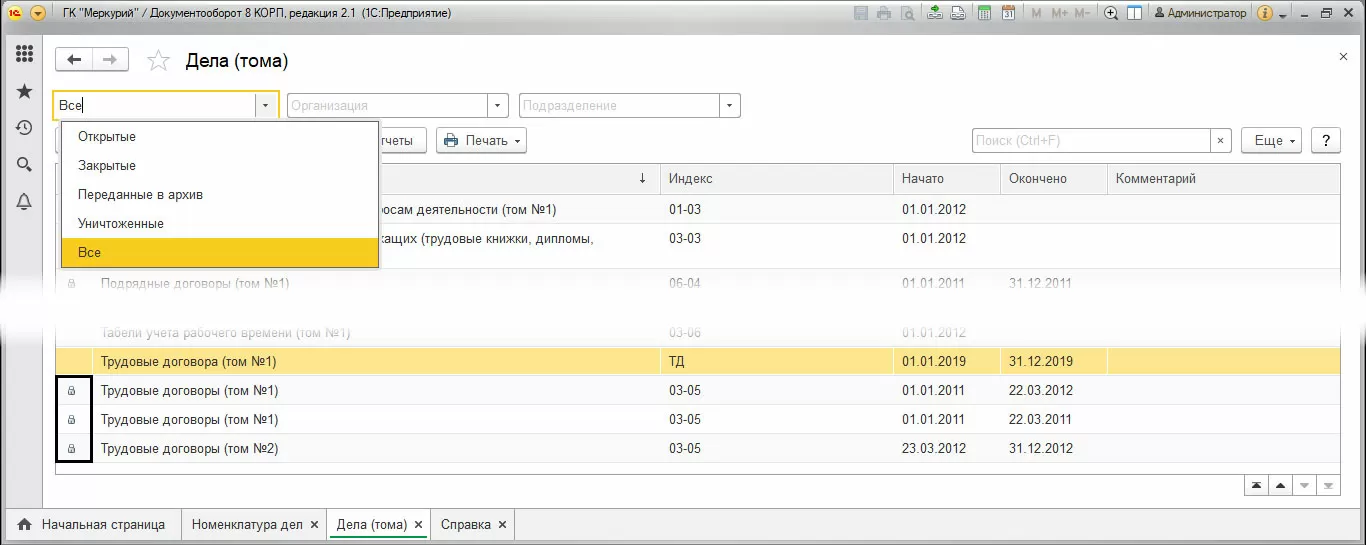 Если дело закрыто (установлена соответствующая галочка), то в списке оно отображается с замком. Для отображения дел (томов) можно устанавливать отбор – открытые, закрытые, переданные в архив, уничтоженные или показать все, а также отбор по организации и подразделению.