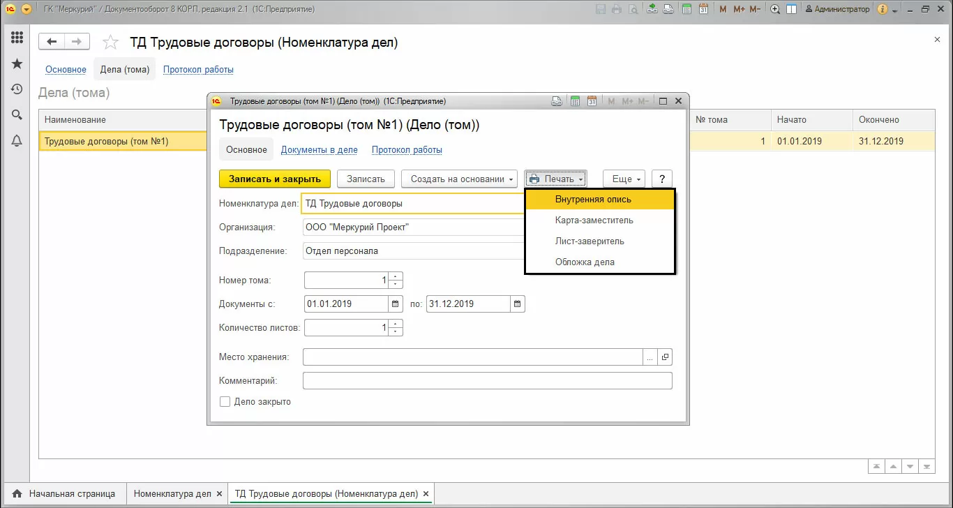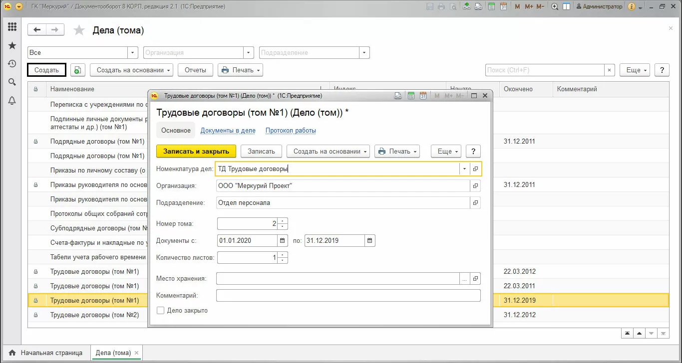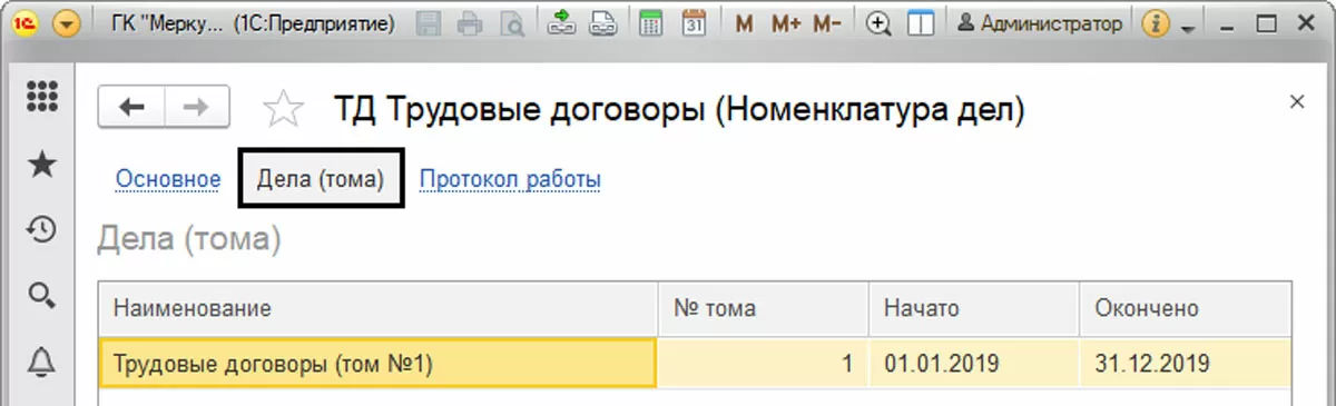 Перечень дел (томов) можно также увидеть в справочнике «Номенклатура дел» на одноименной закладке «Дела (тома)».
