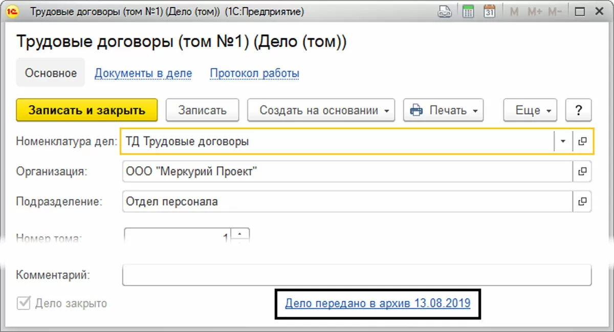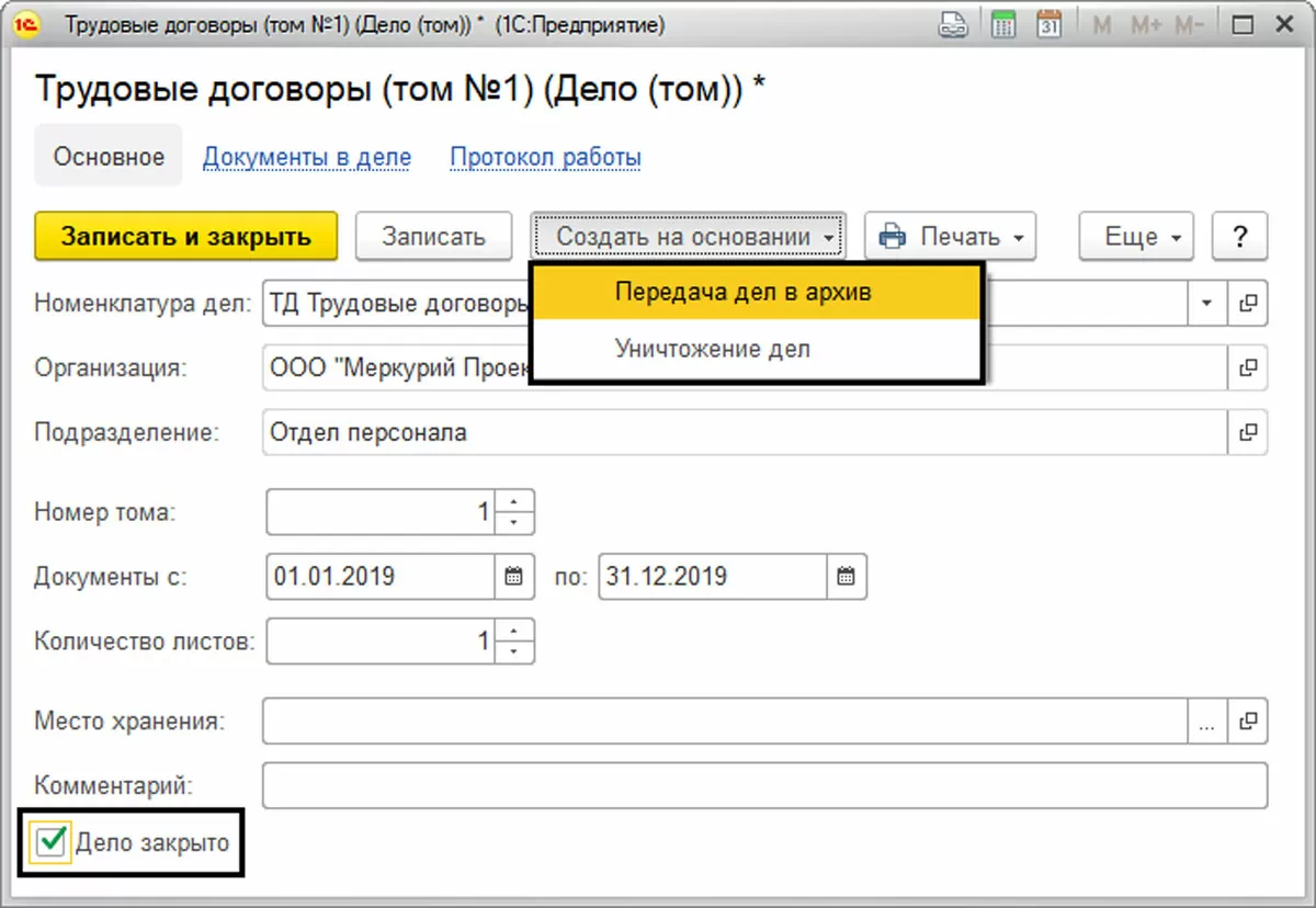 Находясь в карточке дела (тома), можно создать на основании документы «Передача дел в архив» и «Уничтожение дел». При передаче в архив предварительно устанавливают галочку, что дело закрыто.