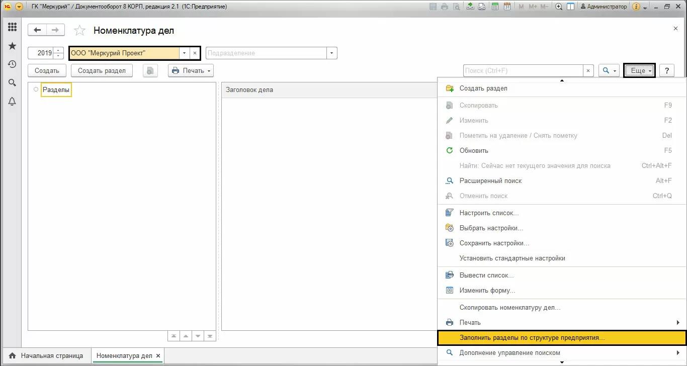 В программе «1С:Документооборот», исходя из структуры организации, разделы могут заполняться автоматически. Для этого, указав организацию и нажав кнопку «Еще», выберем команду «Заполнить разделы по структуре предприятия».
