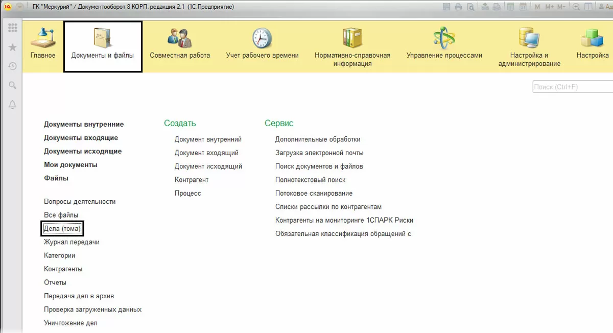 В программе для регистрации дел и томов предназначен одноименный справочник – «Дела (тома)», который доступен из раздела «Документы и файлы-Дела (тома)» или из карточки заголовка номенклатуры дела.