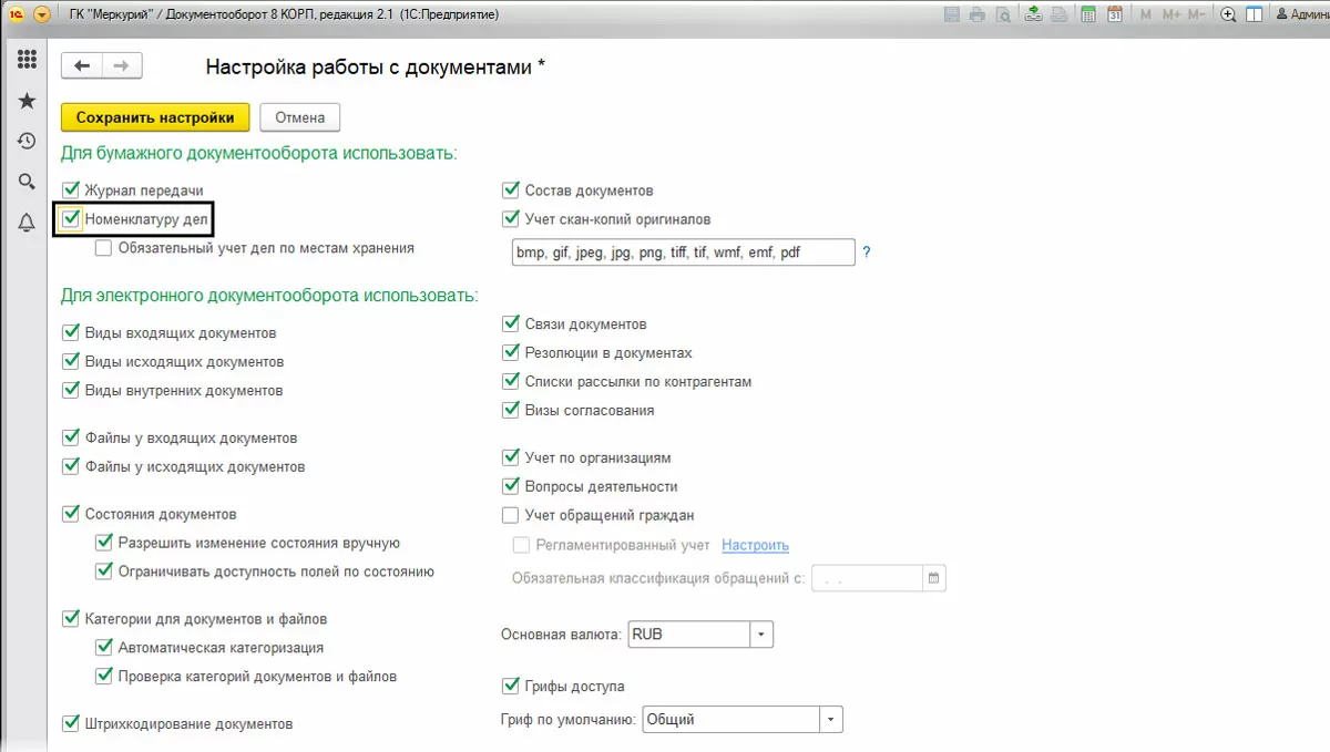 Обратите внимание, при необходимости вести учет по местам хранения документов в настройках устанавливается галочка «Обязательный учет дел по местам хранения».