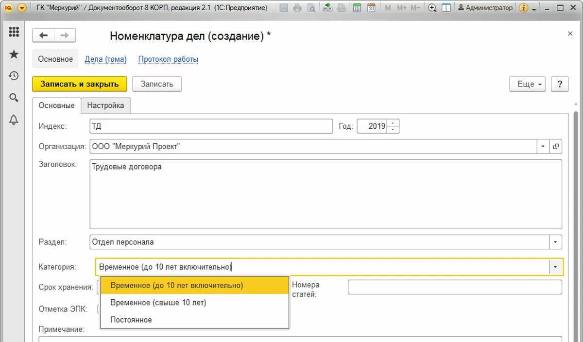 Мы увидели, как данный справочник ведется в разрезе организаций. В разделах также создается перечень номенклатурных дел по усмотрению пользователя. Например, «Секретарь» – «Приказы руководителя», «Переписка руководителя» и т.п., «Отдел кадров (персонала)» – «Трудовые договора», «Приказы по кадрам», «Личные дела сотрудников» и т.п., «Юридическая служба» – по видам договоров, документов. В карточке дела указывается индекс, год, заголовок, раздел, категория, срок хранения и т.д.