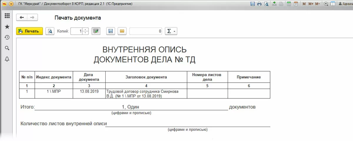 В деле (томе) может быть множество документов, но документ может включаться только в одно дело. Из справочника «Номенклатура дел», открыв дело (том), можно просмотреть его состав, а по нажатию на «Печать» распечатать документы из доступных разделов: «Внутренняя опись», «Карта-заместитель», «Лист-заверитель», «Обложка дела».