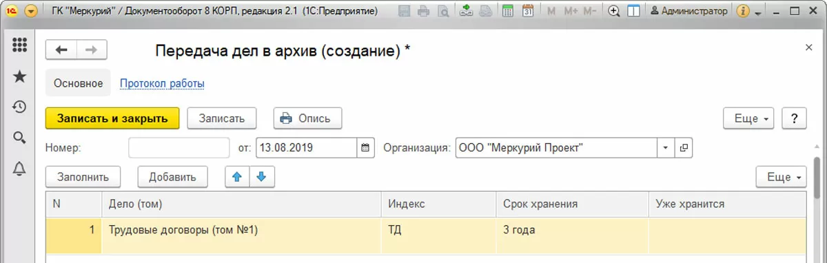 Программа «1С:Документооборот» поддерживает возможность ведения номенклатуры дел в электронном виде: по сути, создается своего рода аналог бумажной папки, куда будут складываться документы. В системе можно задать необходимые настройки и организовать тома для хранения исполненных документов, а если том закрыть, то поместить в него документ будет уже нельзя.