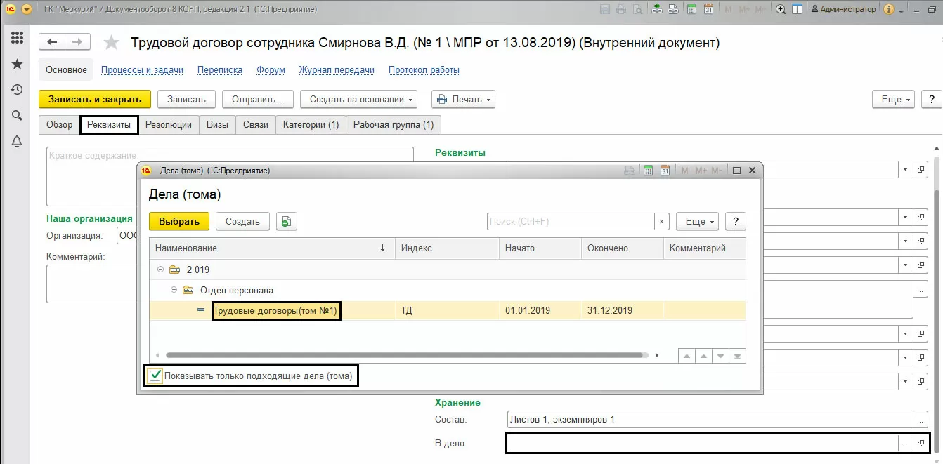 Для того чтобы поместить какой-либо документ в дело (том), при его создании следует заполнить поле «Дело» в нижней части документа на закладке «Реквизиты». В открывшемся окне выбрать том, в который необходимо его поместить. Программа автоматически подскажет нужный том. Если мы уберем галочку «Показывать только подходящие тома», будут отражены все текущие тома.