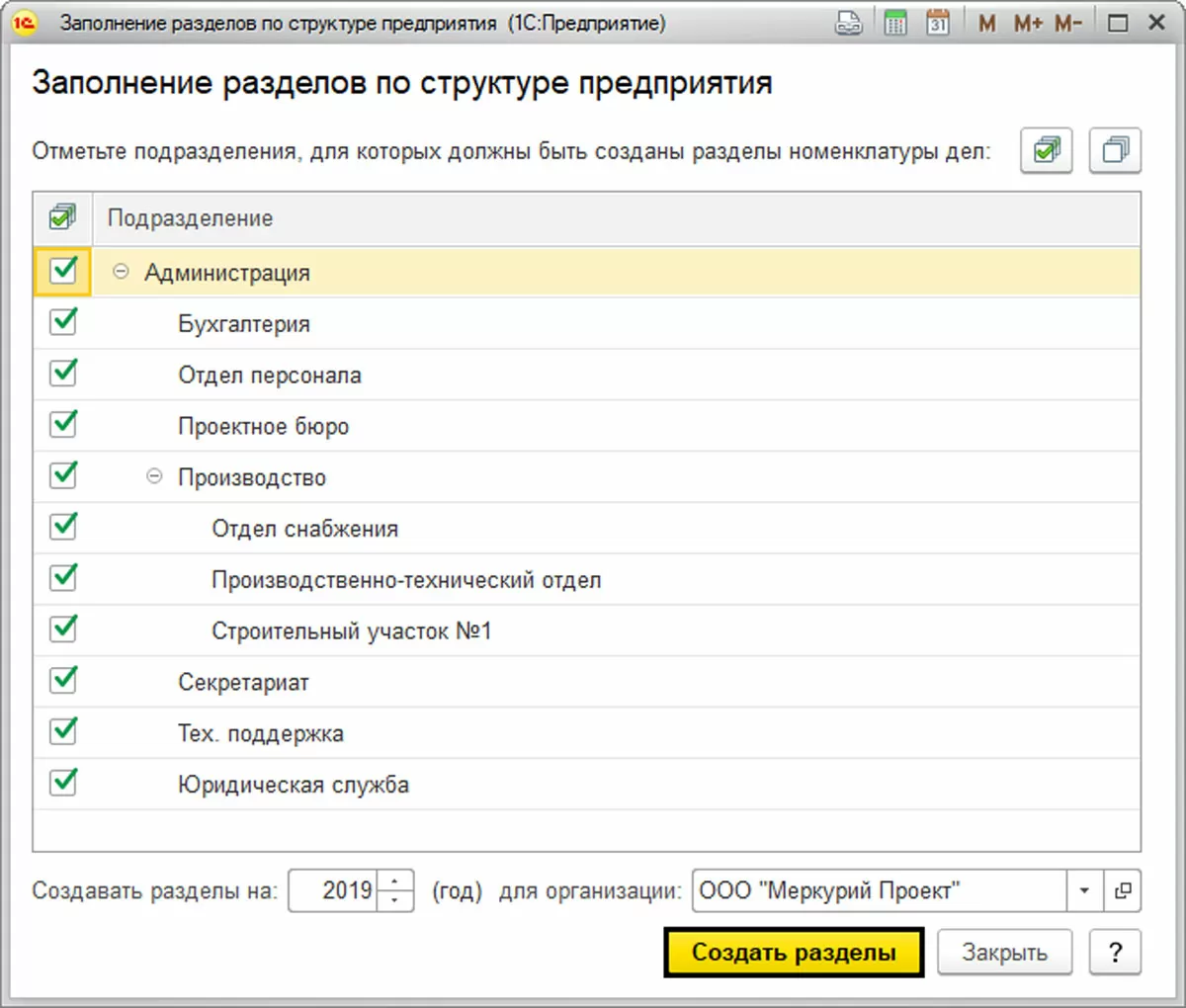 Программа отобразит имеющуюся структуру организации (подразделения), и, по нажатию кнопки «Создать разделы», выделенные пользователем подразделения будут скопированы в справочник «Номенклатура дел» как разделы.