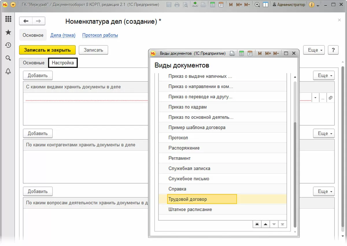 В «Настройках» можно указать, какие виды документов, по каким контрагентам или каким вопросам деятельности хранить в деле.