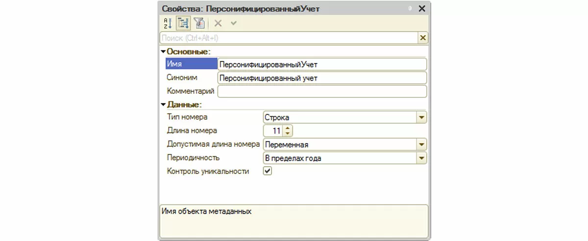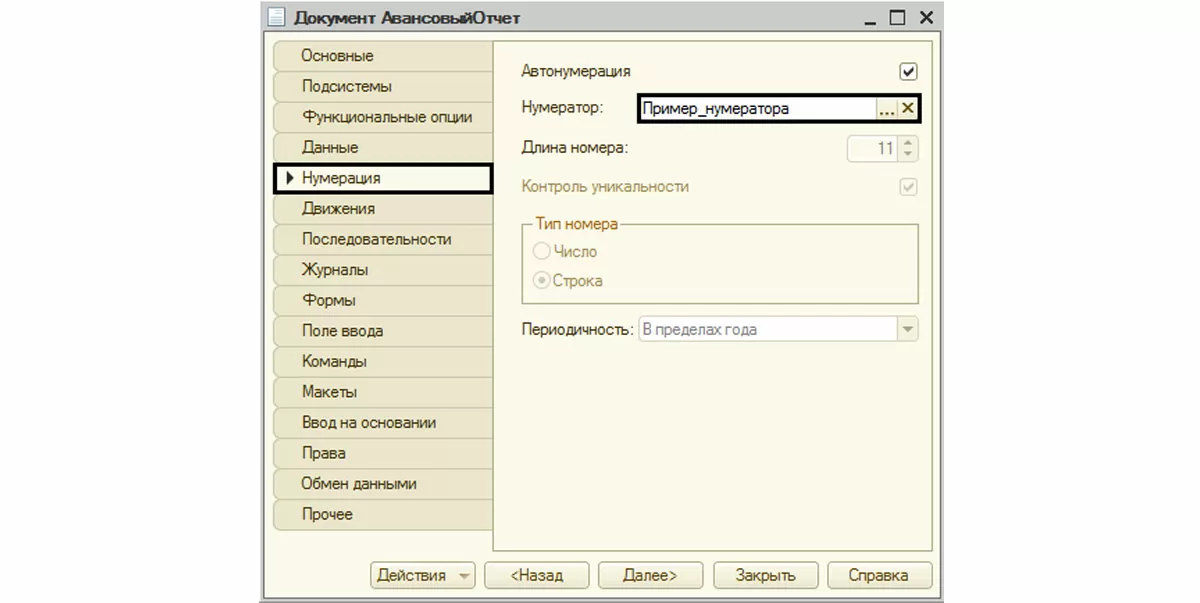 Откроем любой документ в режиме «Конфигуратор» и на закладке «Нумерация» посмотрим предустановленные разработчиком настройки для этого раздела. В свойствах установлена галочка для автонумерации, проверки уникальности, контроля длины номера и задана периодичность.