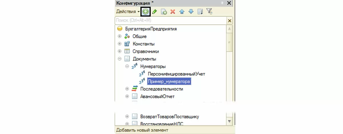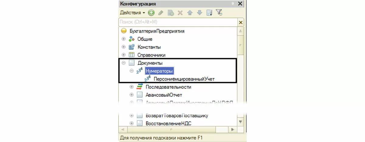 С помощью объекта «Нумератор» есть возможность назначить сквозную нумеровку для документации сразу нескольких типов. Этот объект метаданных находится внутри дерева «Документы-Нумераторы».